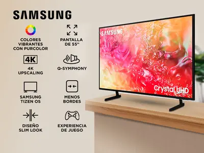 En resumen, el Samsung DU7000 de 55" es un Smart TV con pantalla Crystal UHD 4K, HDR, Tizen OS, y buena conectividad (Wi-Fi, Bluetooth, 3 HDMI, 2 USB). Ideal para cine en casa, gaming casual y streaming con colores vibrantes y sonido sincronizado.